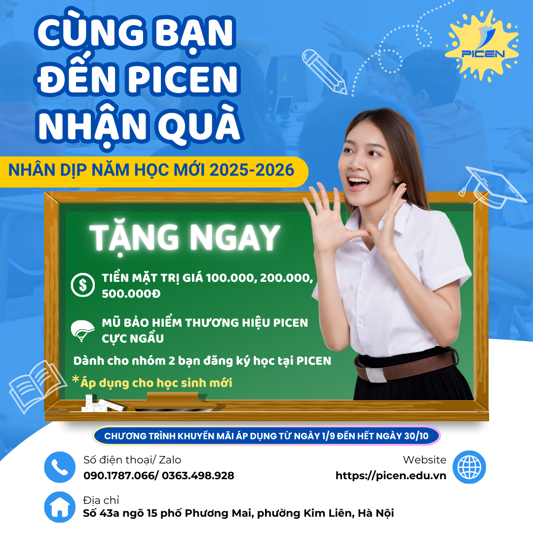 Nhằm chào đón năm học mới 2025–2026, Trung tâm PICEN triển khai chương trình quà tặng hấp dẫn dành cho học sinh mới đăng ký học. Đây là cơ hội để các em vừa được trải nghiệm môi trường học tập chất lượng, vừa nhận quà giá trị.
